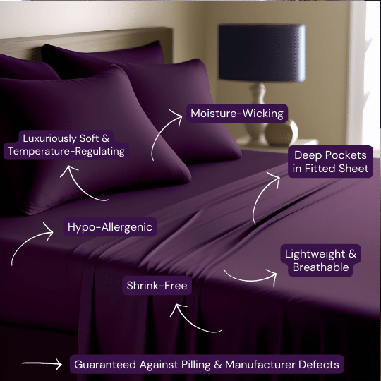 Want to feel like royalty? Our elegant dark purple (eggplant) sheets are made with high quality double brushed microfiber yarns, giving them their luxurious soft feel and extreme durability. Comparable to 1800 thread count cotton sheets, with 14" deep pockets that stretch to accommodate up to a 17 inch mattress. These sheets will not disappoint, nor will they pill, shrink, or fade and are wrinkle resistant. Sweet Sheets® "Saskatoon Pie" microfiber sheets are a great addition to your bedroom decor pairing well with other rich colors, and also make a great and luxurious gift. Available in California King, King, Queen, Double, Twin & Twin XL sizes.