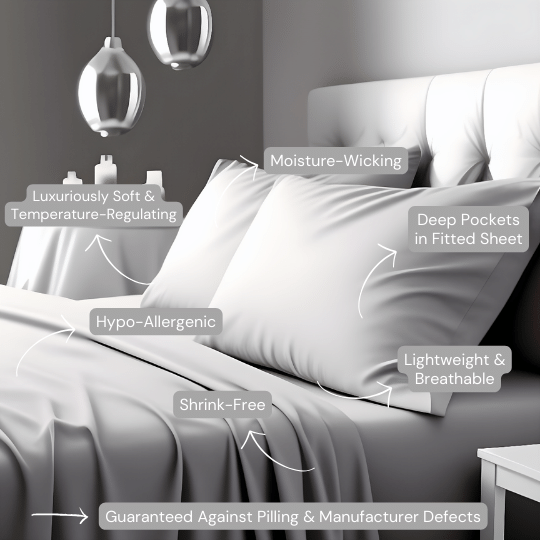 Our best selling trendy cool, light grey sheets are made with high quality double brushed microfiber yarns, giving them their luxurious soft feel and extreme durability. Comparable to 1800 thread count cotton sheets, with 14" deep pockets that stretch to accommodate oversized mattresses with toppers, these sheets will not disappoint! Nor will they pill, shrink, or fade and are wrinkle resistant. With 30% less bulk than regular cotton sheets, Sweet Sheets® "Silver Sprinkles" microfiber sheets take less water to wash, and less energy to dry! They are a great addition to your bedroom decor and also make a great and luxurious gift. Available in Split King, California King, King, Queen, Double, Twin & Twin XL sizes.