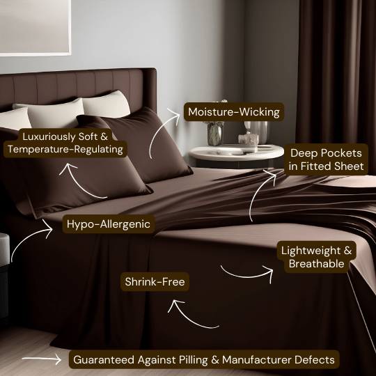 Who doesn't love chocolate? Wrap up in our chocolate colored sheets made with high quality double brushed microfiber yarns, giving them their luxurious soft feel and extreme durability. Comparable to 1800 thread count cotton sheets, with 14" deep pockets that stretch to accommodate oversized mattresses with toppers. These sheets will not disappoint, nor will they pill, shrink, or wrinkle. Sweet Sheets® Chocolate Biscotti" microfiber sheets are a great addition to your bedroom decor and also make a great and luxurious gift. Available in California King, King, Queen, Double, Twin & Twin XL sizes.