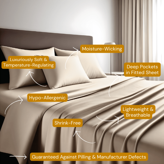 Our beige sheets are a beautifully neutral color and are made with high quality double brushed microfiber yarns, giving them their luxurious soft feel and extreme durability. Comparable to 1800 thread count cotton sheets, with 14" deep pockets that stretch to accommodate oversized mattresses with toppers, these sheets will not disappoint! Nor will they pill, shrink, or fade and are wrinkle resistant! Sweet Sheets® "Crème Brûlée" microfiber sheets are a great addition to your bedroom decor and also make a great and luxurious gift. Available in Split King, California King, King, Queen, Double, Twin & Twin XL sizes.