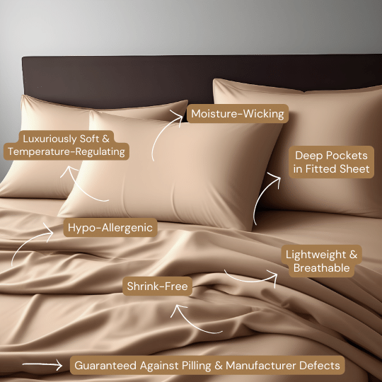 Our cozy khaki "Mocha Cheesecake" sheets are made with high quality double brushed microfiber yarns, giving them their luxurious soft feel and extreme durability. Comparable to 1800 thread count cotton sheets, with 14" deep pockets that stretch to accommodate oversized mattresses with toppers, these sheets will not disappoint! Nor will they pill, shrink, or fade and are wrinkle resistant. With 30% less bulk than regular cotton sheets, Sweet Sheets® "Mocha Cheesecake" microfiber sheets take less water to wash, and less energy to dry!